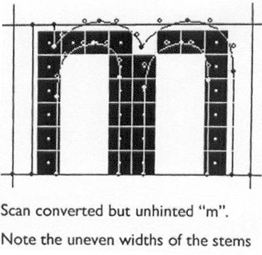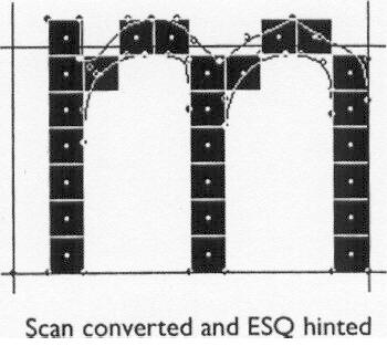 az alacsony felbontású képernyőkön történő jó olvashatóság érdekében a kevesebb rendelkezésre álló képpontból a betű stílusára jellemző és a jó olvashatóságot is biztosító alappontok kijelölése (esztétikai és célszerűségi szempontok alapján, a nyilatkozat ezt az eljárást "ESQ hintingnek" nevezi, lásd a 2. ábrát);